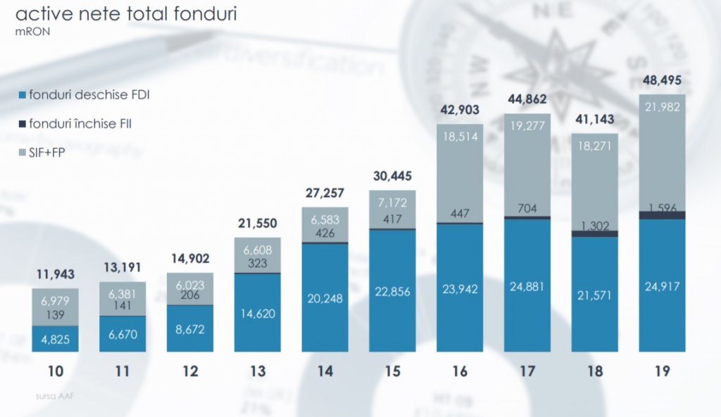 Potrivit acestuia, împărţirea între categoriile de fonduri, respectiv fonduri deschise de investiţii şi fonduri închise de investiţii, este de circa 50% – 50%, astfel că, la finele anului trecut membrii AAF administrau active de 48,4 miliarde de lei.