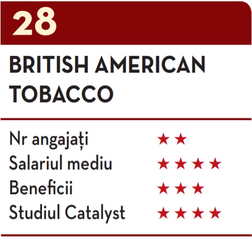 Astfel, echipa de la București a BAT România a crescut cu circa 50%, de la 200 de persoane la aproape 300 de angajați. Per total, compania a ajuns astfel la un număr de circa 900 de salariați, cea mai mare parte a echipei regăsindu-se la fabrica de țigări de la Ploiești, deținută de cel mai mare producător de țigări.