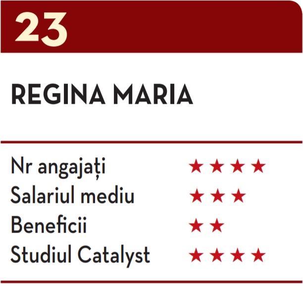 Rețeaua de sănătate Regina Maria este unul dintre cei mai mari angajatori din sectorul privat de sănătate, având peste 6.000 de angajați și colaboratori în cele 65 de locații proprii din București și din țară.