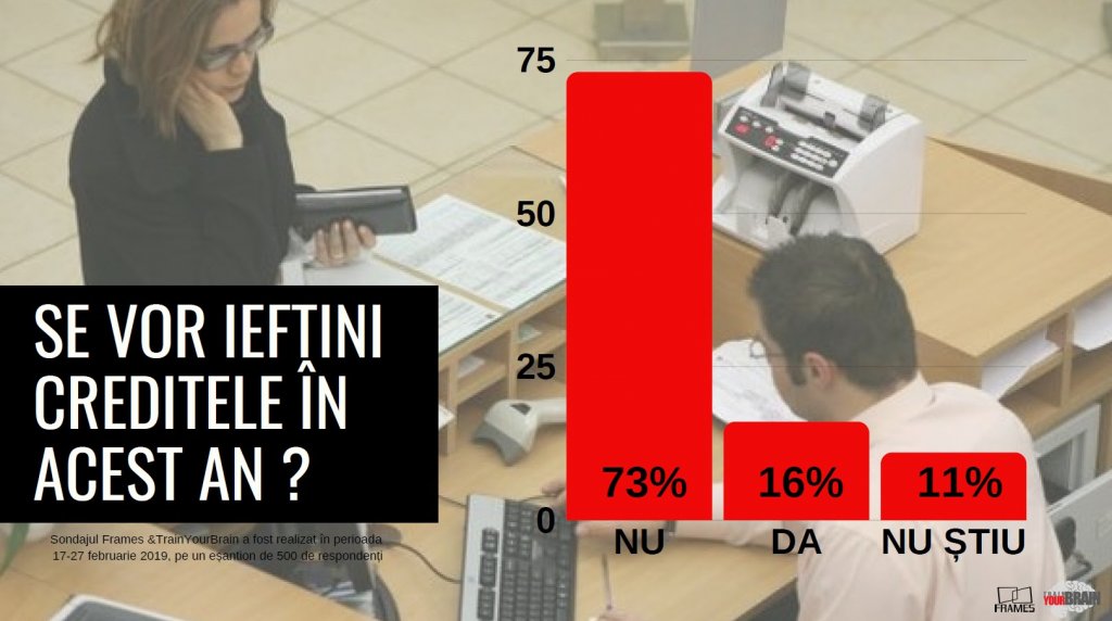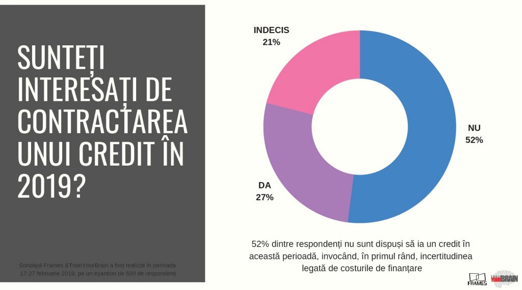 Potrivit sondajului realizat în perioada 17-27 februarie, de compania de consultanță Frames și cea de traininguri Train Your Brain, lansat astăzi la Cluj-Napoca, la evenimentul Train Your Business, numai 27% dintre români sunt deciși să contracteze un credit în 2019, în timp ce 21% au evitat să ofere un răspuns, invocând, în principal, cadrul financiar impredictibil.