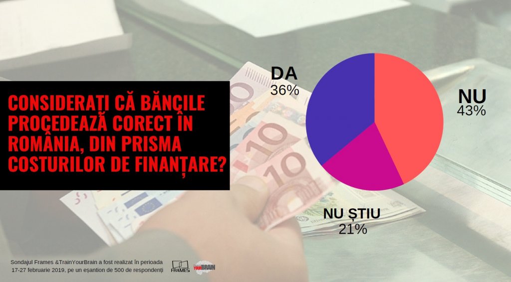 Întrebați dacă consideră că băncile procedează corect în România, din prisma costurilor de finanțare, 43% dintre respondenți au indicat un răspuns negativ, 21% au răspuns afirmativ, în timp ce 36% au marcat răspunsul ,,nu știu’’.